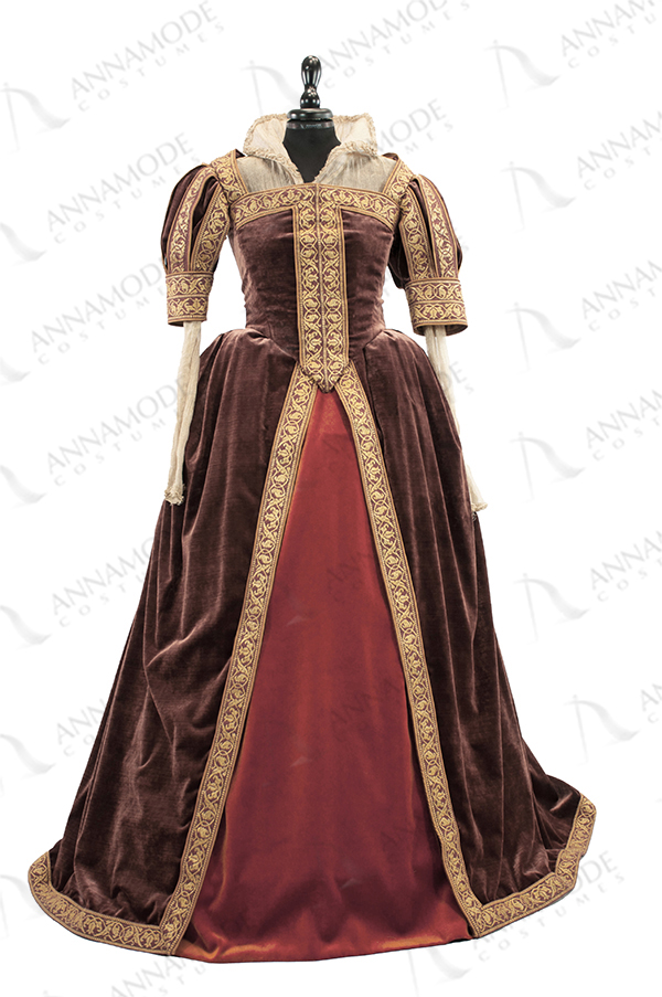Complete woman: bodice mm, over-the-sleeve with pinchers and gold and brick trimmings, over-skirt with the same profiles, brick velvet. rust velvet skirt. gold embossed laminated blouse, with raised collar.