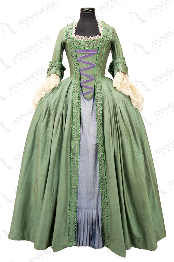 Woman dress in green silk shantung edged with ruches in the same fabric; decorated with falls and neckline in yellow lace and crossed ribbon in lilac velvet; underlying skirt with pleats in light blue silk shantung.
