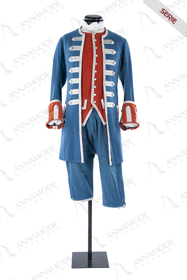 Divisa militare:inquartata e pantalone al polpaccio in panno carta da zucchero;gilet e paramani ruggine;profili gallone e bottoni argento;camicia garza bianca,ml,collo a pistagna con bottone metallo traforato;sciarpina a nastro stesso tessuto.
